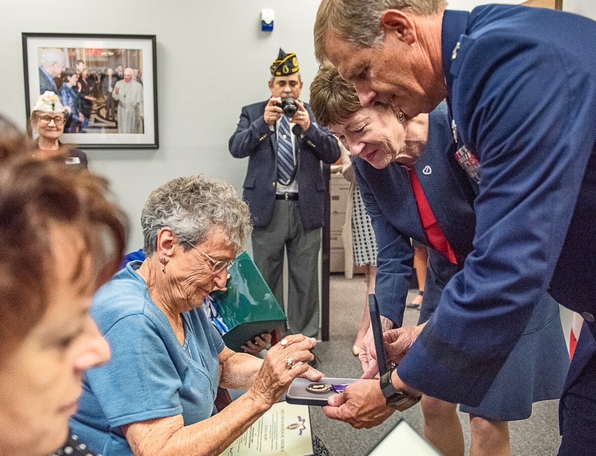 Arthur Labbay, who was shot in France and later lived in Lewiston, receives his overdue medal Wednesday with the help of Sen. Susan Collins’s office.