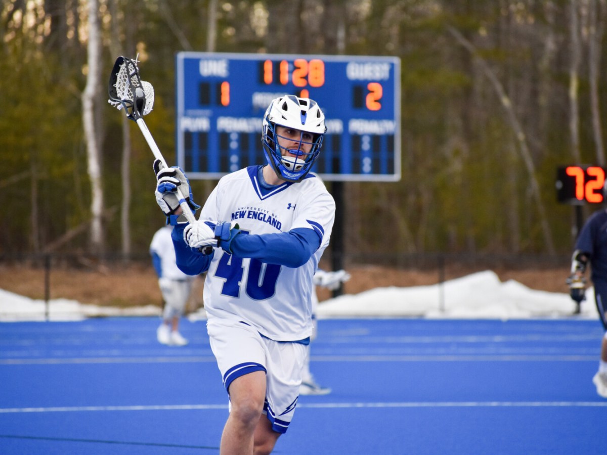 Gorham’s Alex York scores three goals against the Huskies in UNE’s 24-10 win.