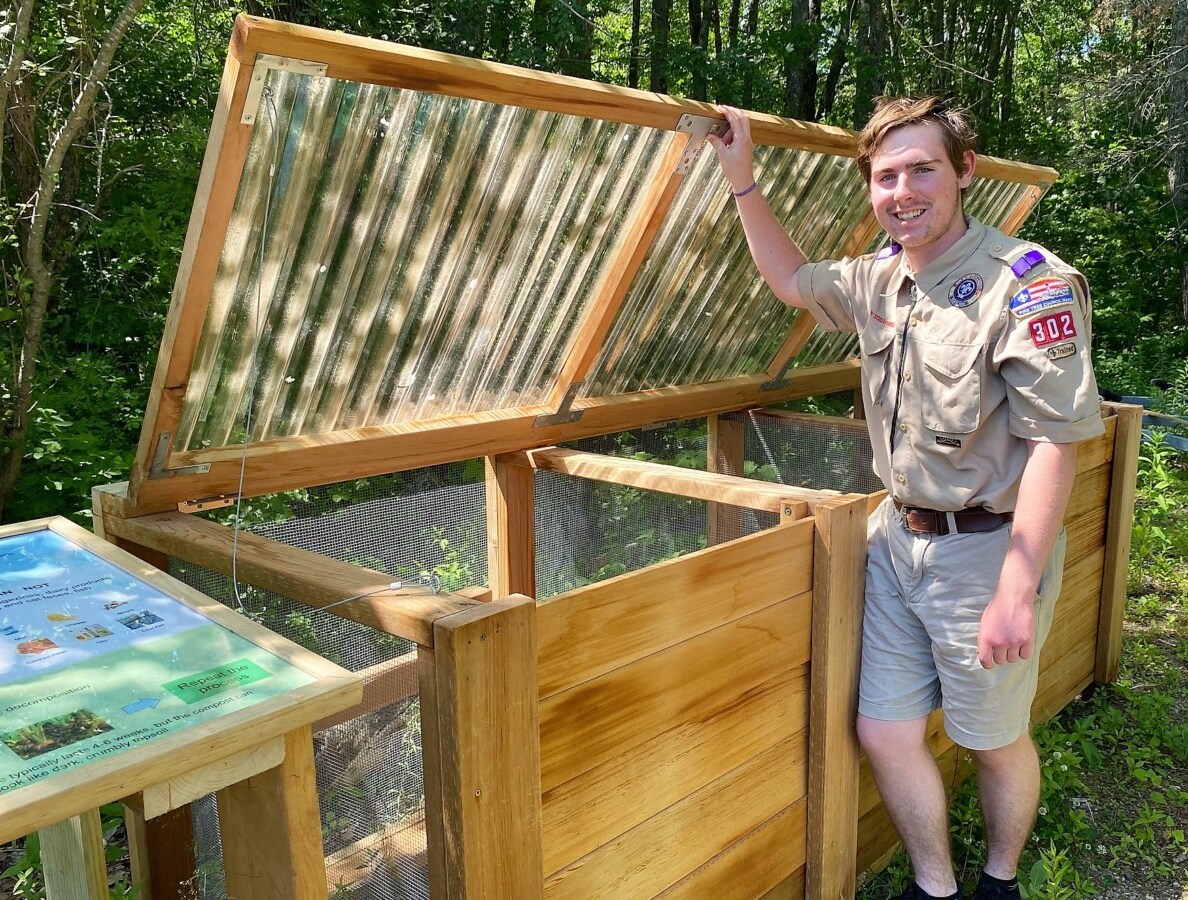 Sean Horgan’s project involved designing and building a three-compartment compost bin for Kennebunkport Conservation Trust and an educational piece to go along with it.