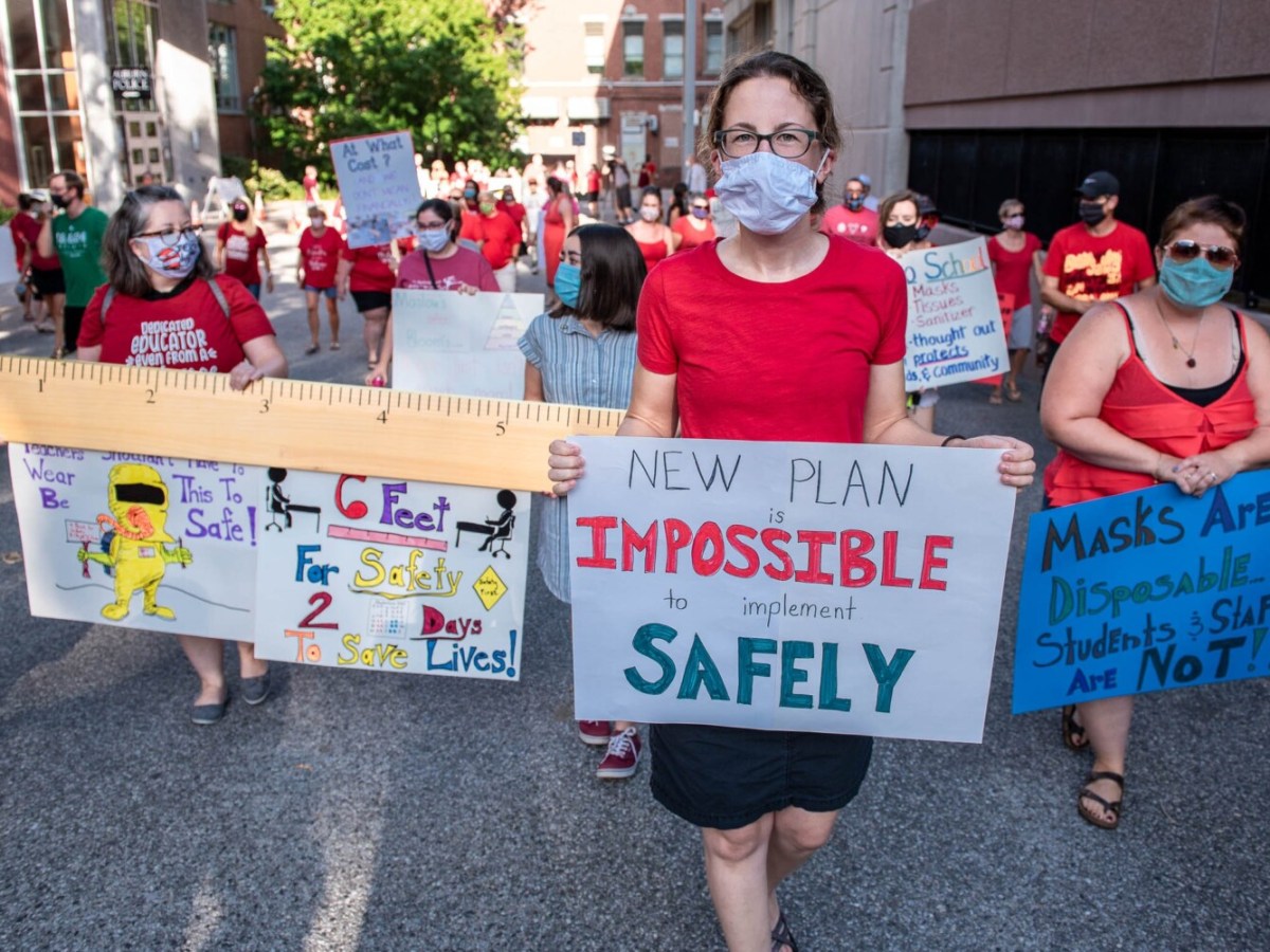 The group was speaking out against the school board’s reopening plan that was approved on Aug. 5.