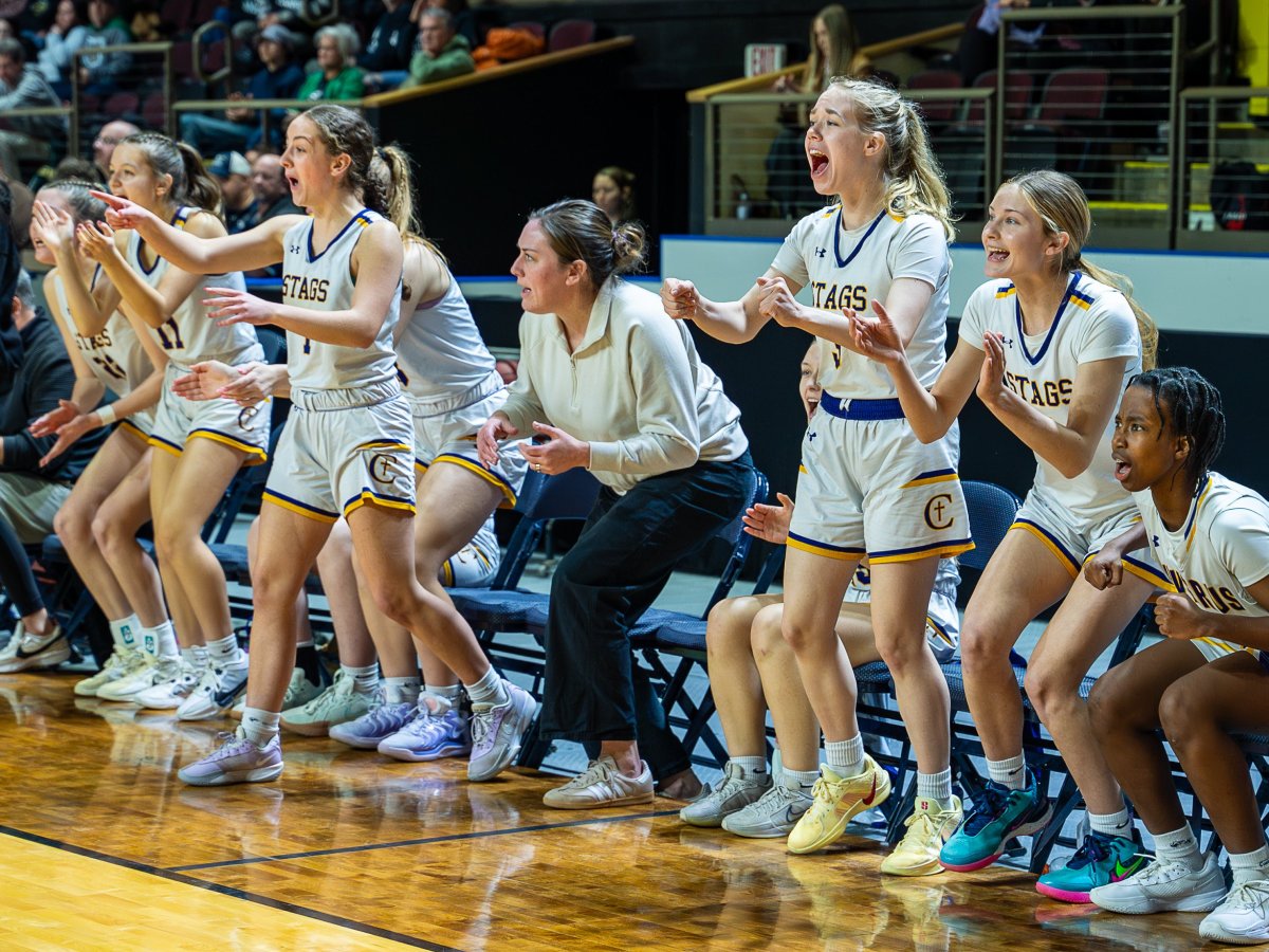 Stags get double-doubles from sophomores Addison Jordan and Abby Kelly and race to 53-41 victory.