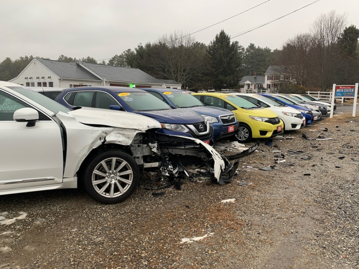 Shawn Robert, the owner of Roberts Auto Center, said a woman crashed into a Volvo SUV parked near the road for sale, causing a domino effect.