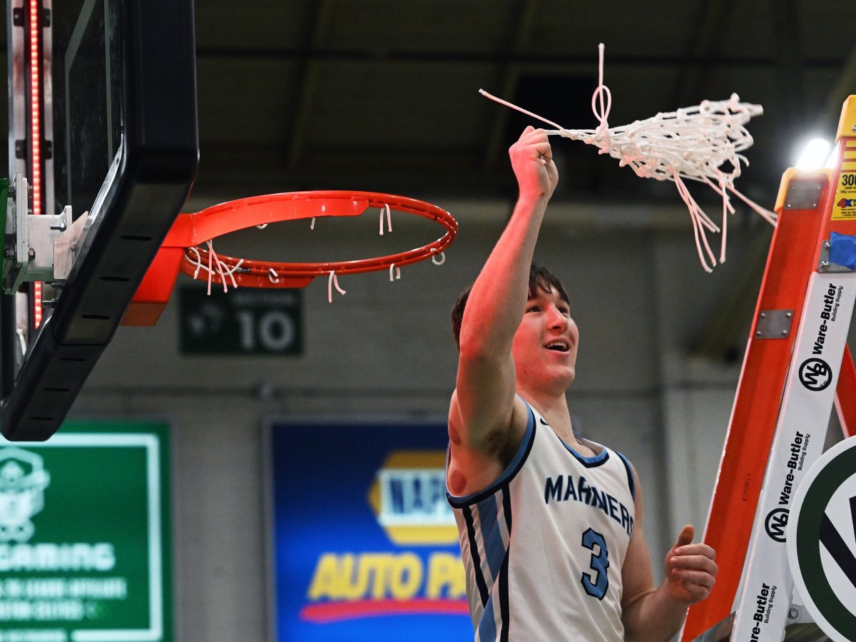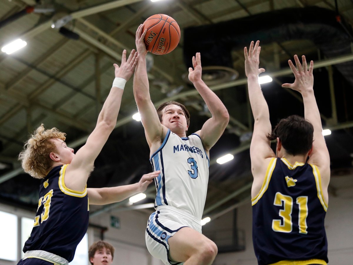 Carter Galley scores 35 points for the undefeated Mariners in a 73-48 victory over Lincoln Academy in the South final.