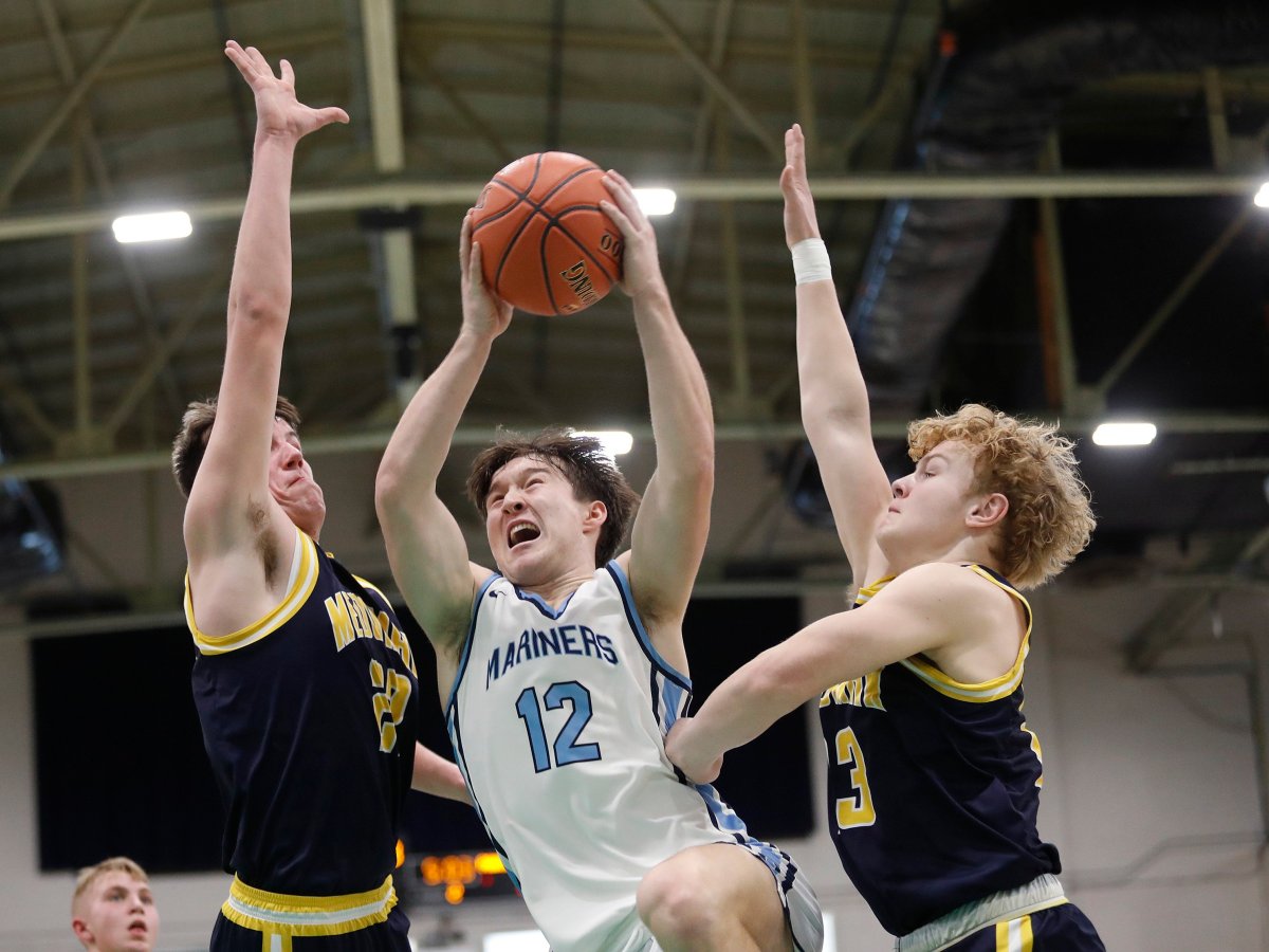 The undefeated and top-seeded Mariners get 17 points from Cohen Galley and 11 from Trevin Ripley en route to a 46-32 win over Medomak Valley.