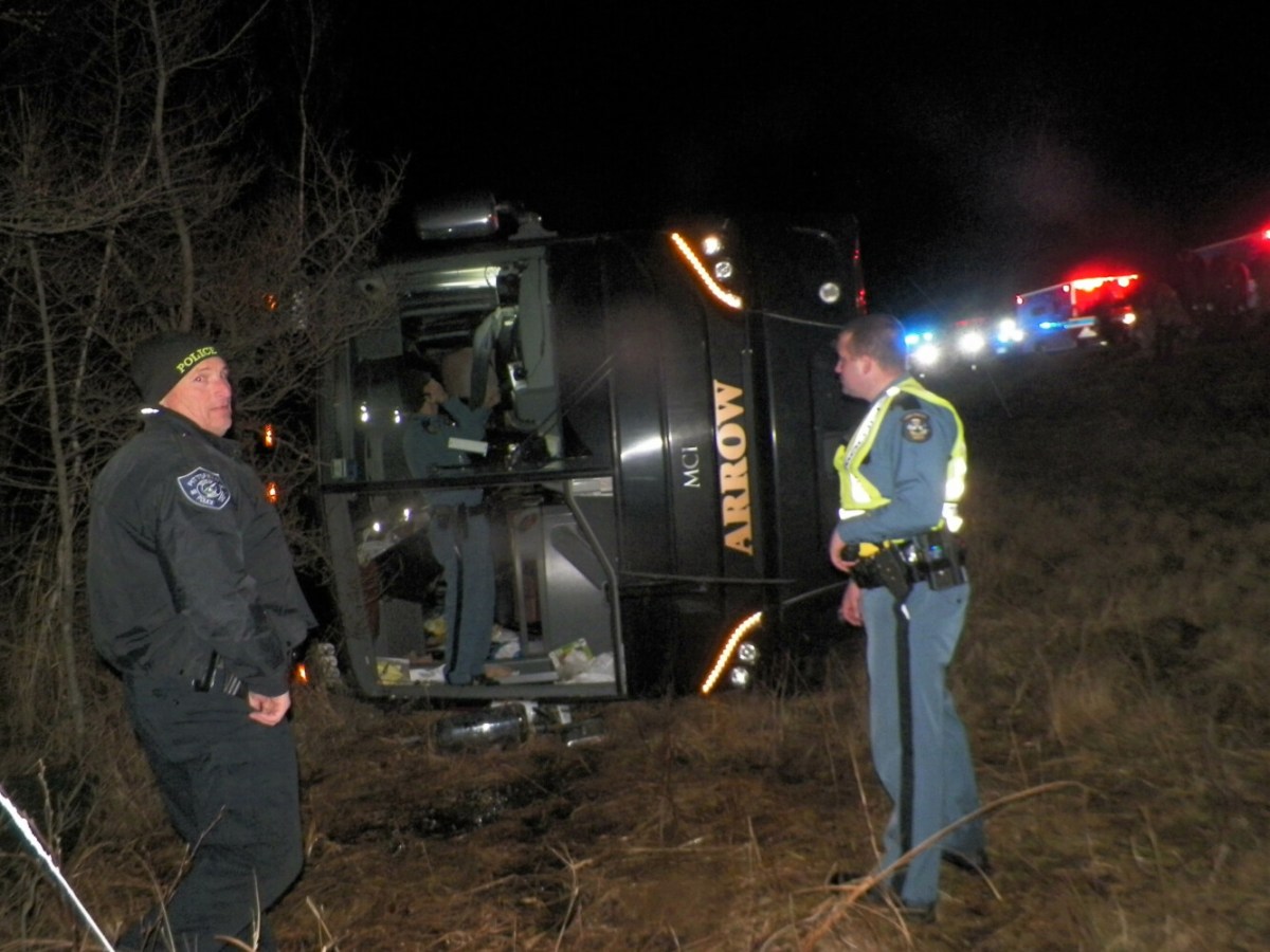 Police say the northbound charter bus carrying the Nebraska Theatre Caravan drifted off the right side of the road and overturned onto its side on Tuesday night.
