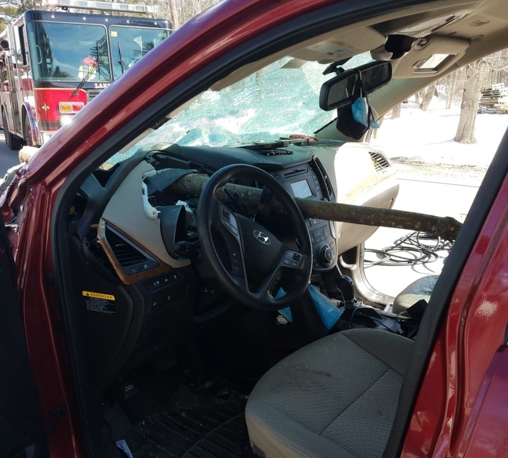 David and Theresa Roy were traveling on Pond Road in Sidney Tuesday when a tree fell on their vehicle in high winds and a branch came through the car and impaled Theresa Roy, who is 79.