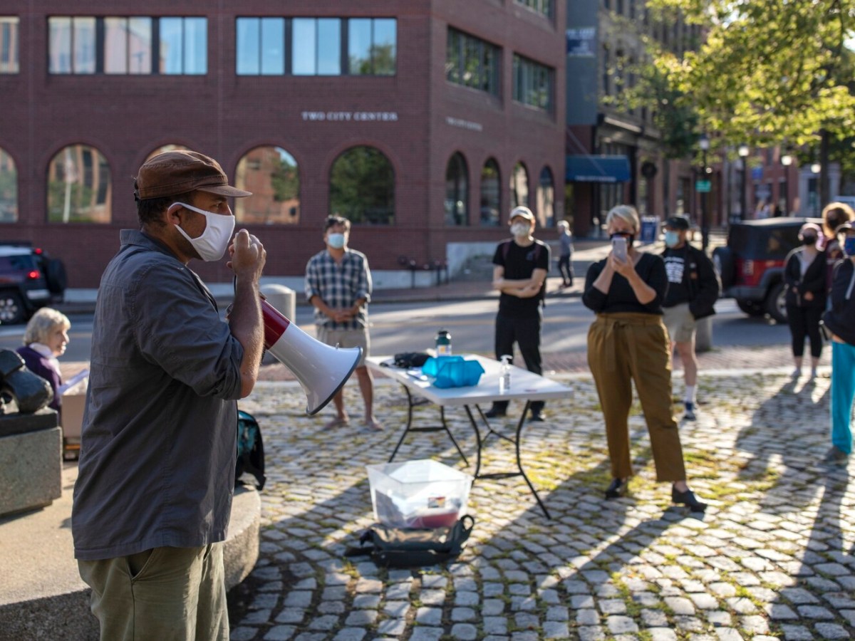About 20 people gathered in downtown Portland to urge action to avoid a wave of evictions that could put thousands of Mainers on the streets as winter approaches.