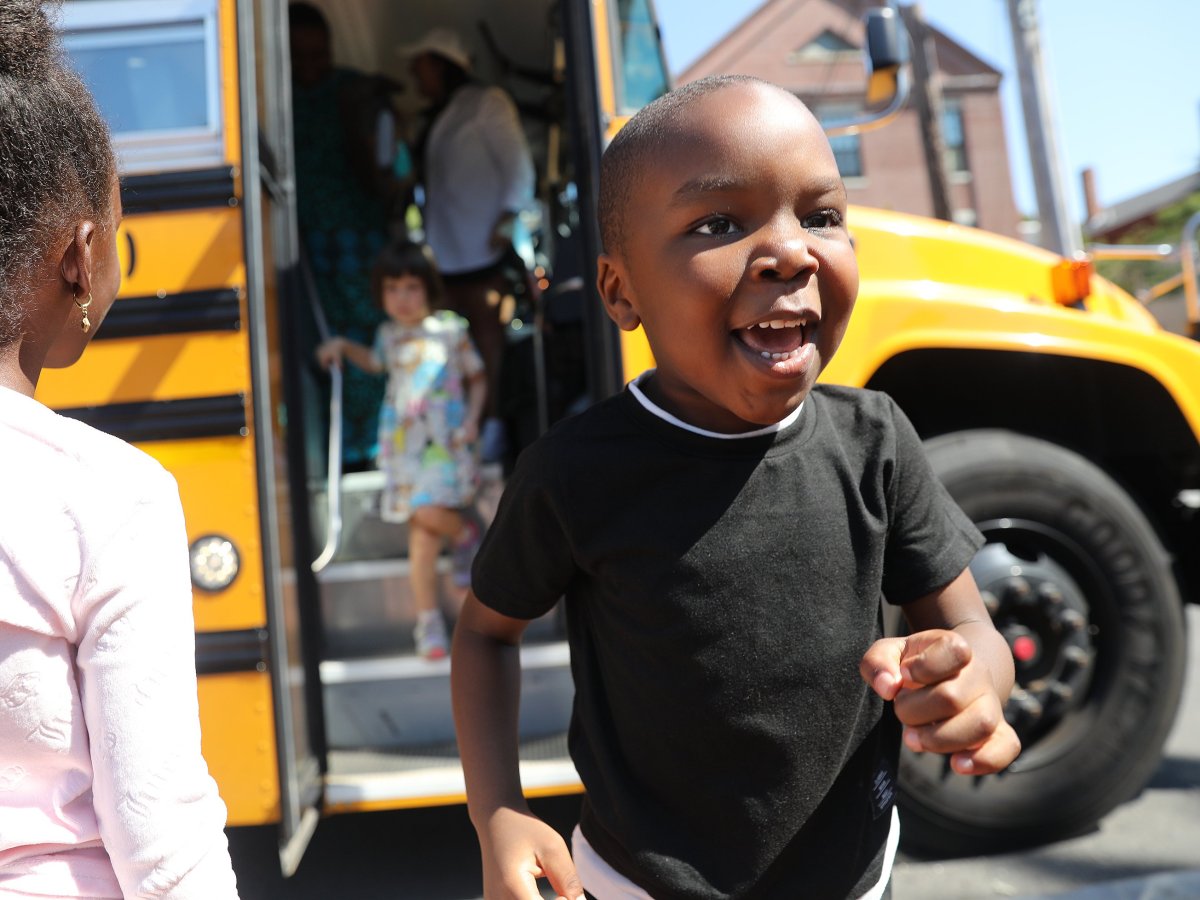 Practice makes perfect as Pre-K and kindergarten students at Reiche Elementary practice riding the bus.