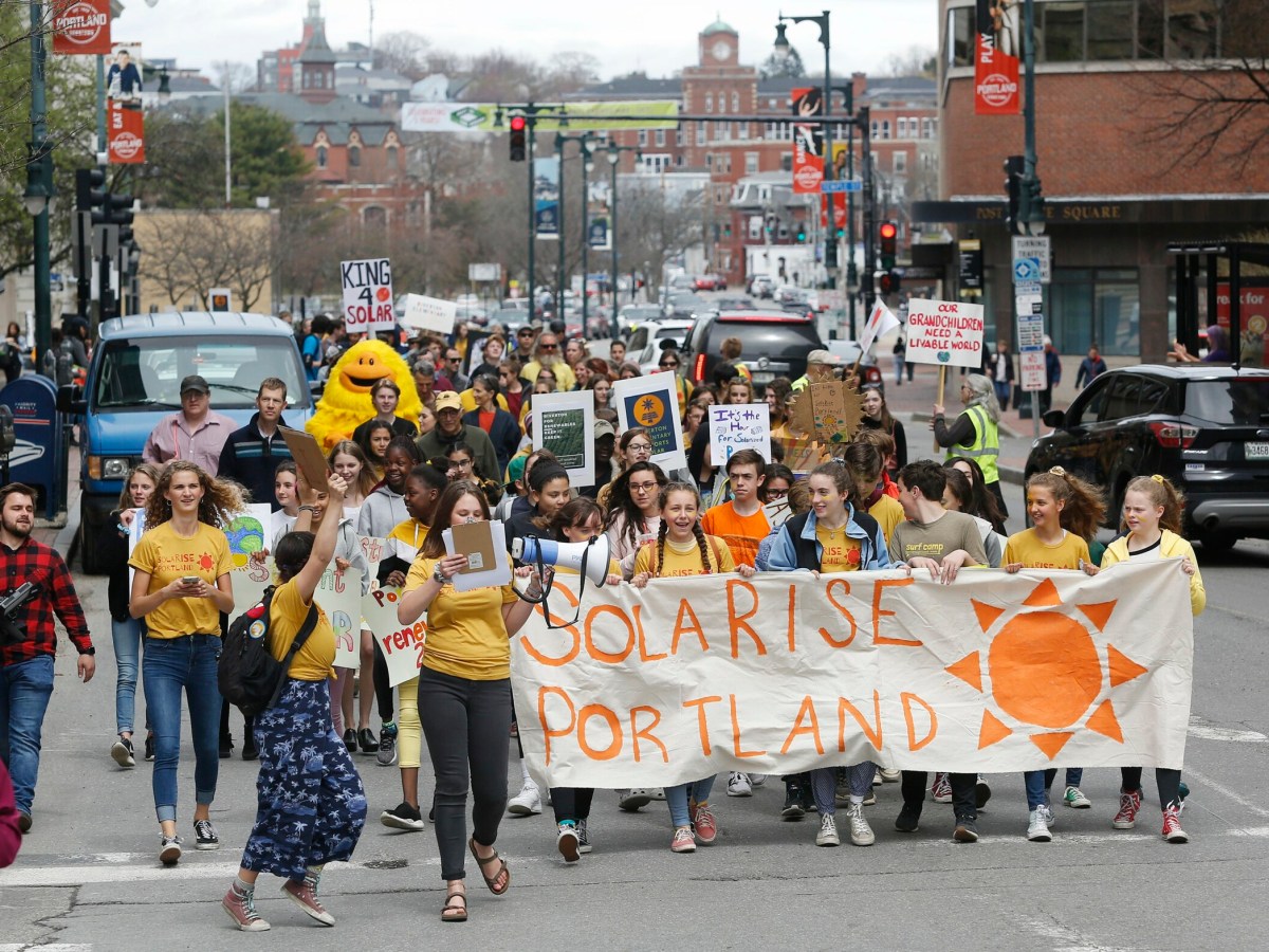 A few hundred students, parents, educators and others promote ‘solarizing’ the city’s schools and moving all city buildings toward 100 percent sustainability.