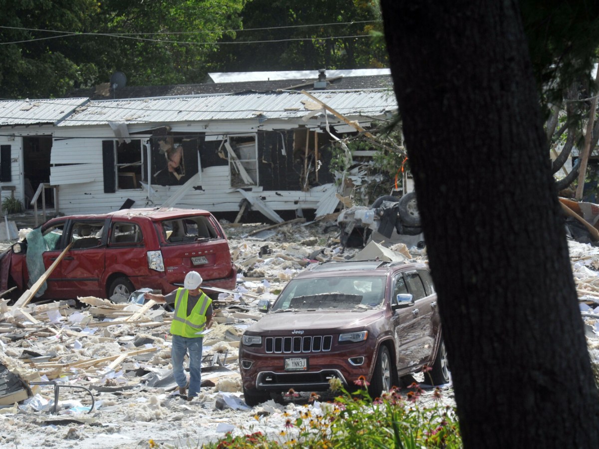 Federal and state officials are working to pinpoint the source of the explosion that killed a firefighter, injured 7 people, destroyed 11 mobile homes and leveled an office building.