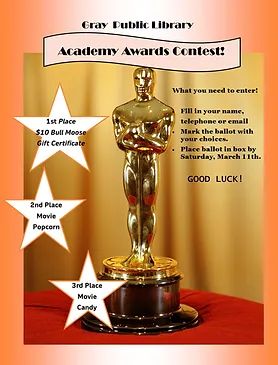 And the winner is … Vote for your favorite movies in the Gray Public Library Academy Awards contest. Submit a ballot to the library by March 11 – look for the gold balloons near the public computers – and winners will be announced March 14. First place wins a $10 Bull Moose gift card, and […]