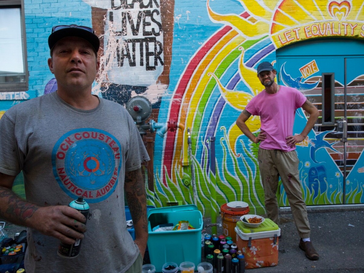 Two artists spent Friday evening painting over what they said included slurs against gay people and Black people on the murals behind the Lancaster Building.