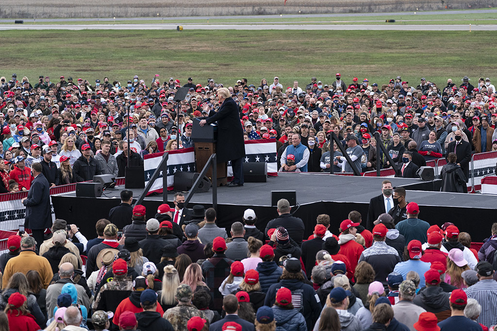 The president stages rallies with thousands of largely mask-less supporters, while the former vice president meets with a few dozen supporters outside a field office.