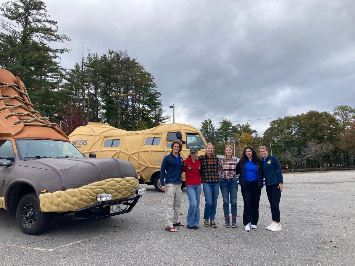A 13.5-foot-tall boot and an 11.5-foot-tall peanut — both on wheels — met in the L.L. Bean employee parking lot Sunday. Instagram handles, honey-roasted peanuts and miniature L.L. Bean boot keychains were exchanged.
