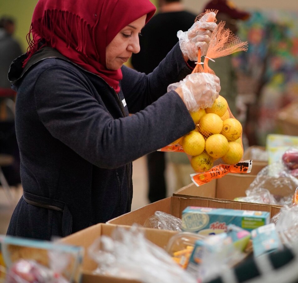 Making a small payment and boxing up the food that they and others bring home is meant to help maintain dignity and build resilience.