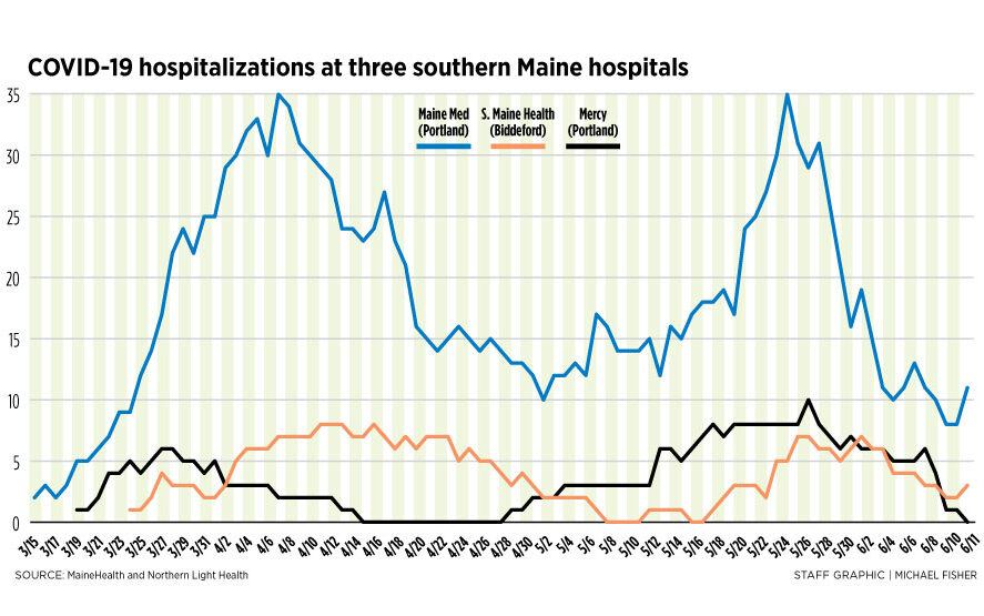 Maine Medical Center’s numbers match the early-April peak, while Mercy Hospital sets a new high.