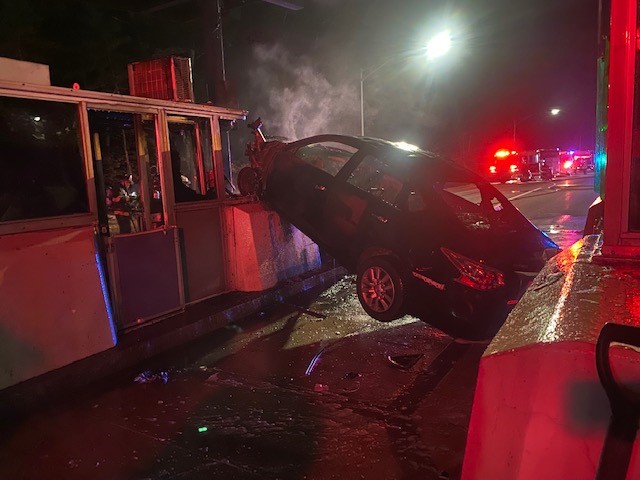 Toll collector injured when car slams into booth, catches fire