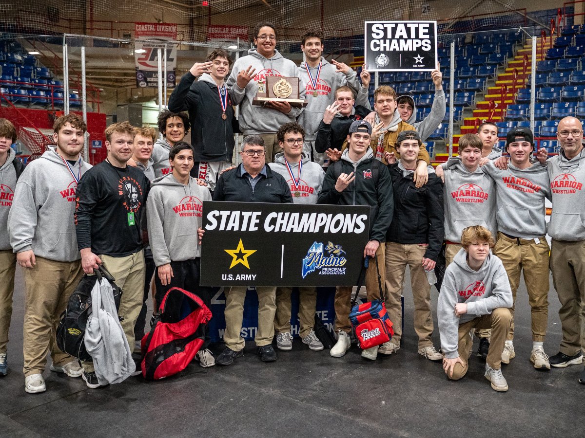Dominic Buxton (165) and Eli Potter (215) win individual titles, helping the Warriors hold off Dirigo.