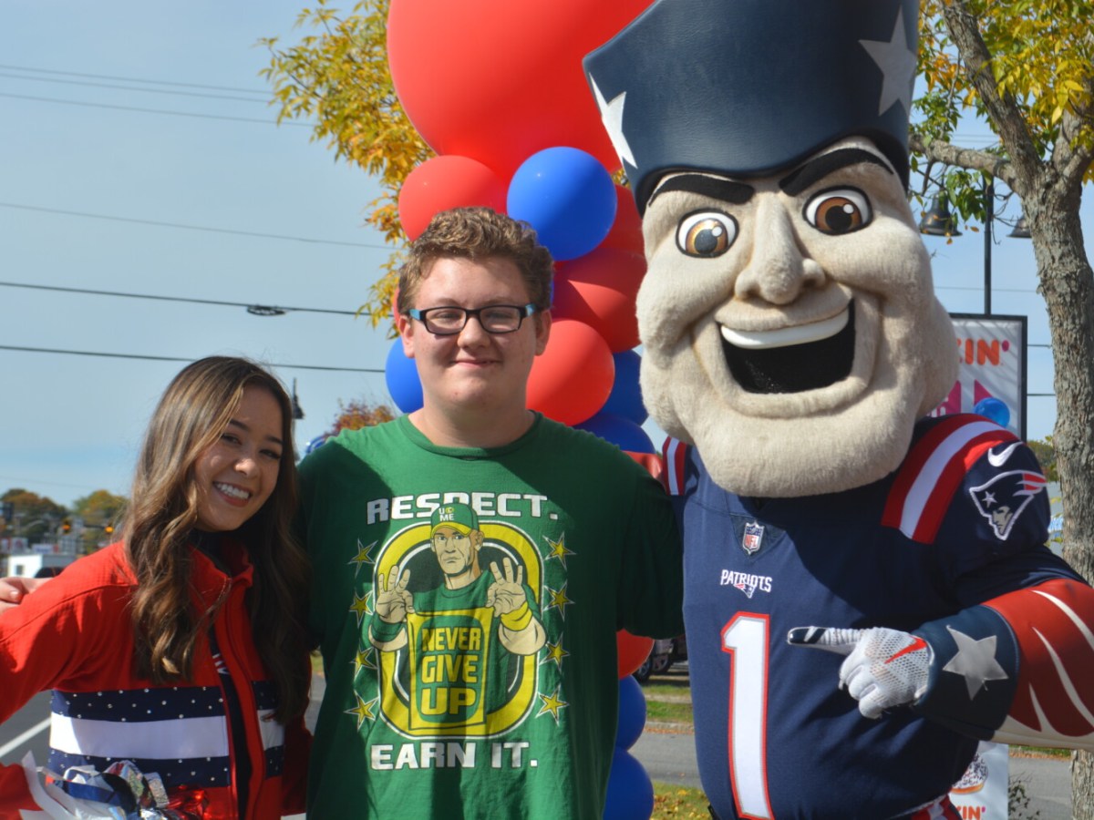 A Westbrook High School student rubs elbows with Pat Patriot and other Patriots representatives Tuesday.