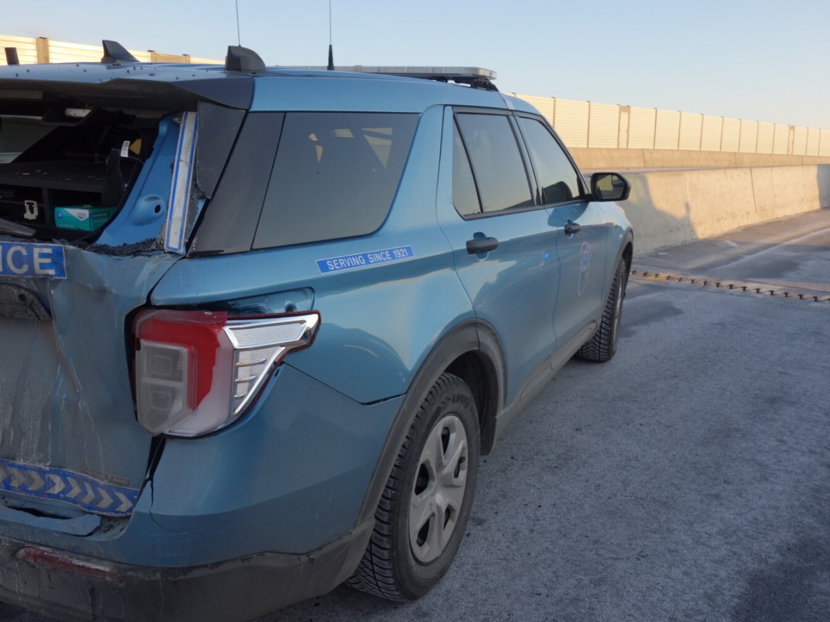 A pickup truck driven on Interstate 95 by a New Hampshire man rear-ended a cruiser on the Piscataqua River Bridge.