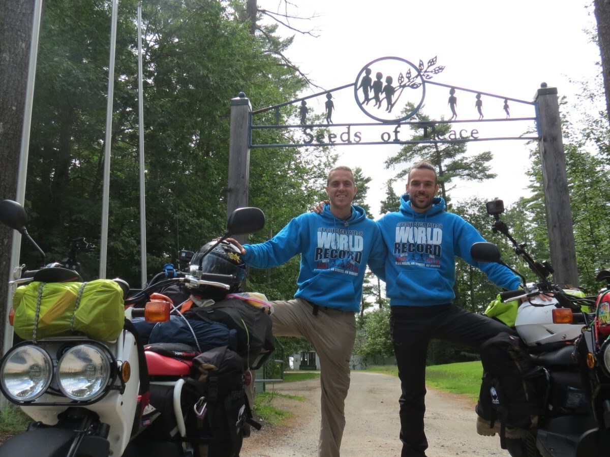 Michael Reid and Yonatan Belik are on a three-month trip across the country on 50cc scooters. On Thursday, they pulled into Seeds of Peace Camp in Otisfield.