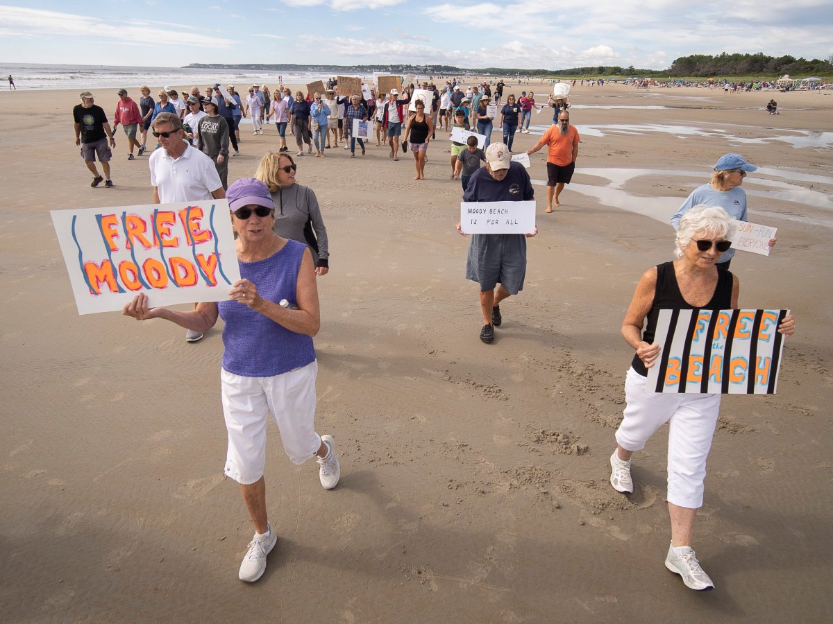 On Saturday, about 100 members of two groups, Our Maine Beaches and Free Moody Beach, participated in a rally that called attention to the longtime dispute over public use of Moody Beach.