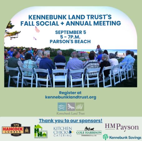Kennebunk Land Trust announced that its annual Fall Social and Annual Meeting will be held Sept. 5 from 5 to 7 p.m. near Parsons Beach. At the meeting, Kennebunk Land Trust will review the past year’s highlights and special projects, announce next year’s goals, and celebrate its volunteers, supporters and community. The evening will include […]