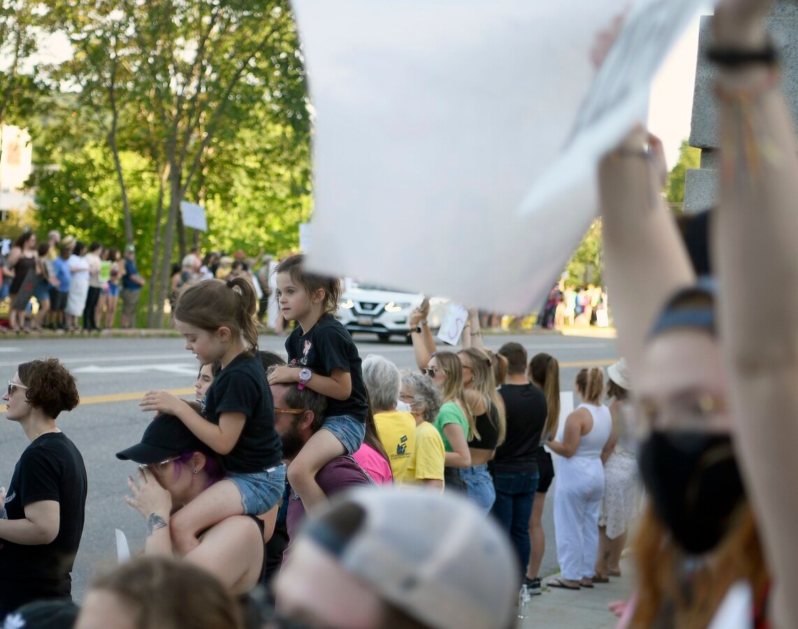 Crowd decries U.S. Supreme Court’s decision to overturn Roe v. Wade, vows to continue the fight.