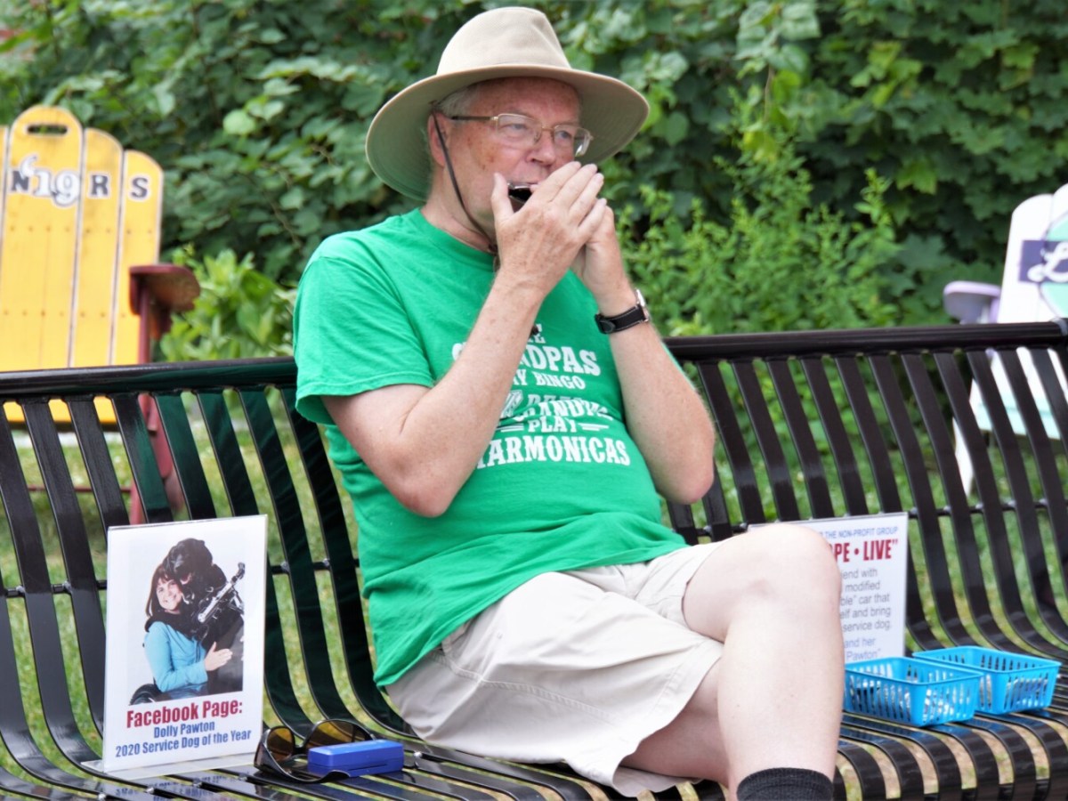 Saco resident Dana Perkins is playing his harmonica to raise money to help a friend.