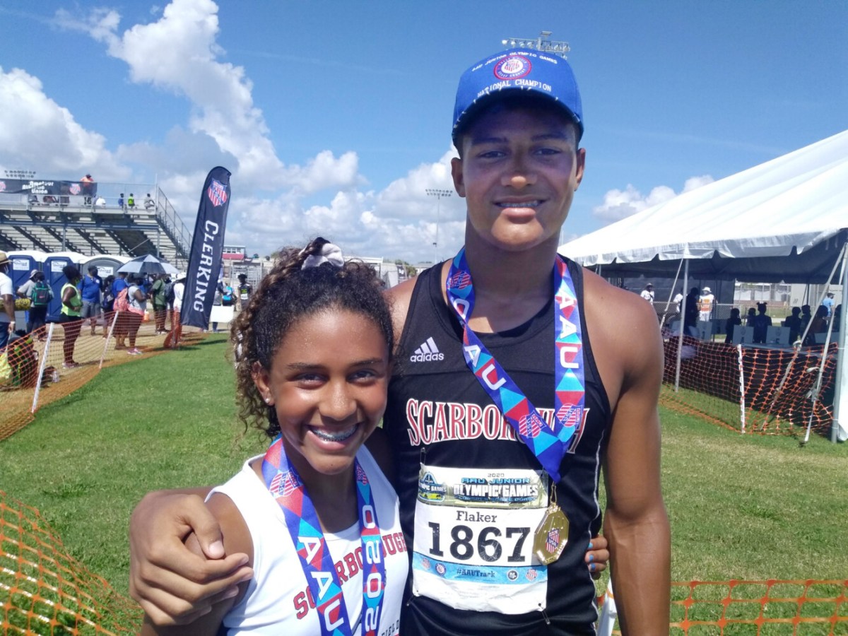 The younger brother of Scarborough sprint star Jarett Flaker wins the AAU Junior Olympics 110 high hurdles for his age group on his 16th birthday, with a time among the best ever for a Maine athlete.