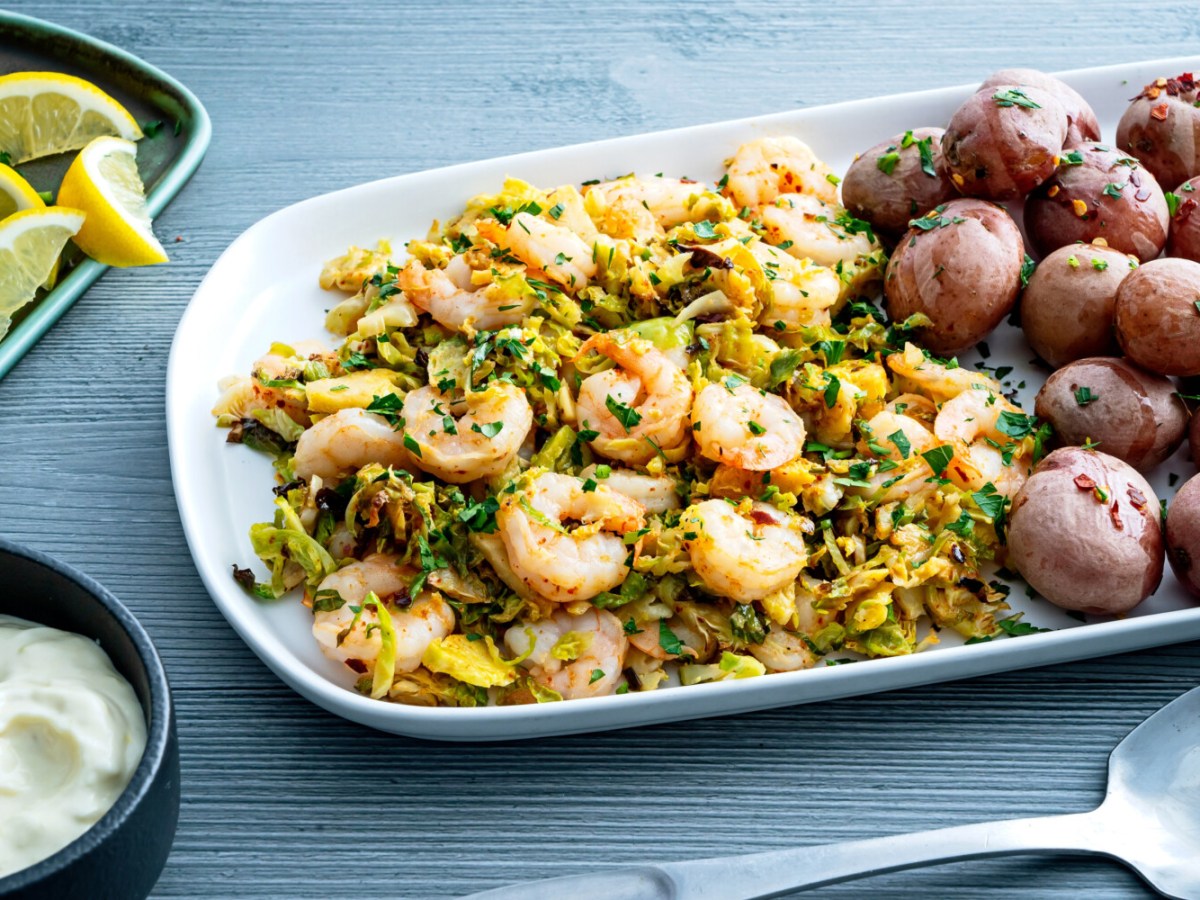 Pair shrimp with shredded Brussels sprouts and a garlicky aioli for a quick, festive supper