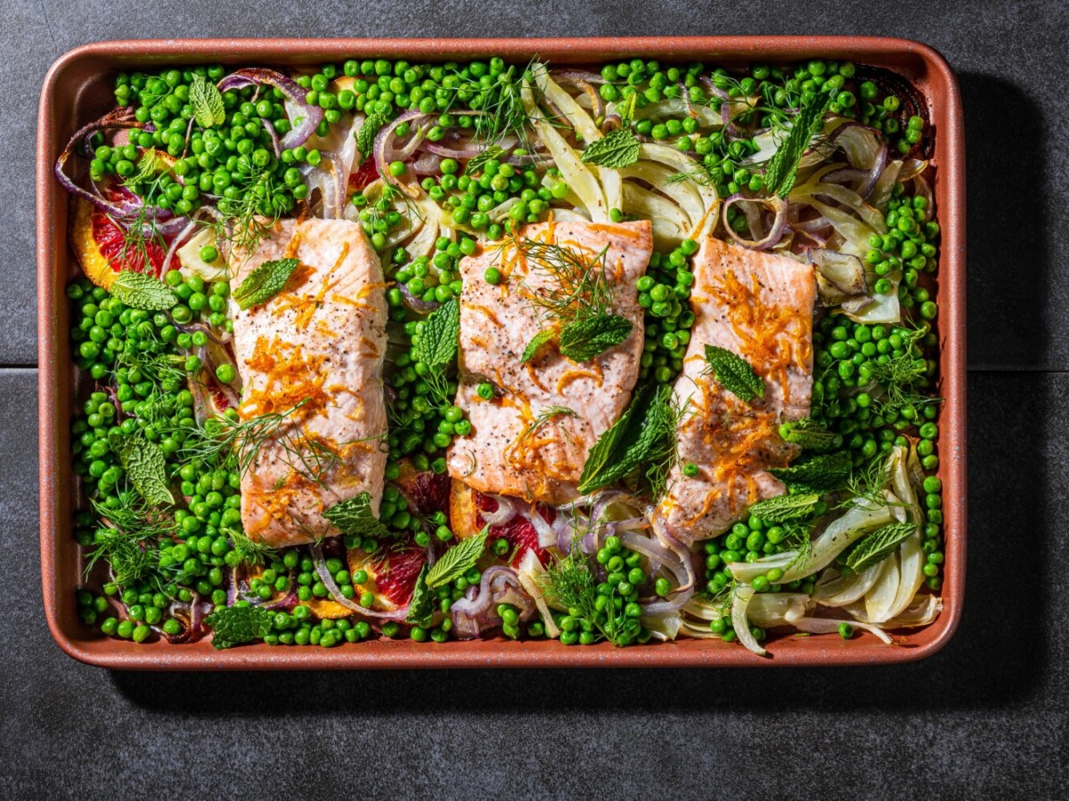 The sweetness of oranges, crunch of fennel and spring peas dressed with mint lend lots of flavor to roasted salmon.
