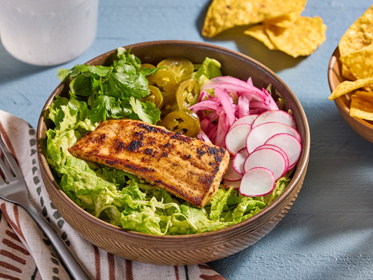 With avocado dressing, radishes, and pickled onions and jalapeño, this fish taco salad is a joy to eat.