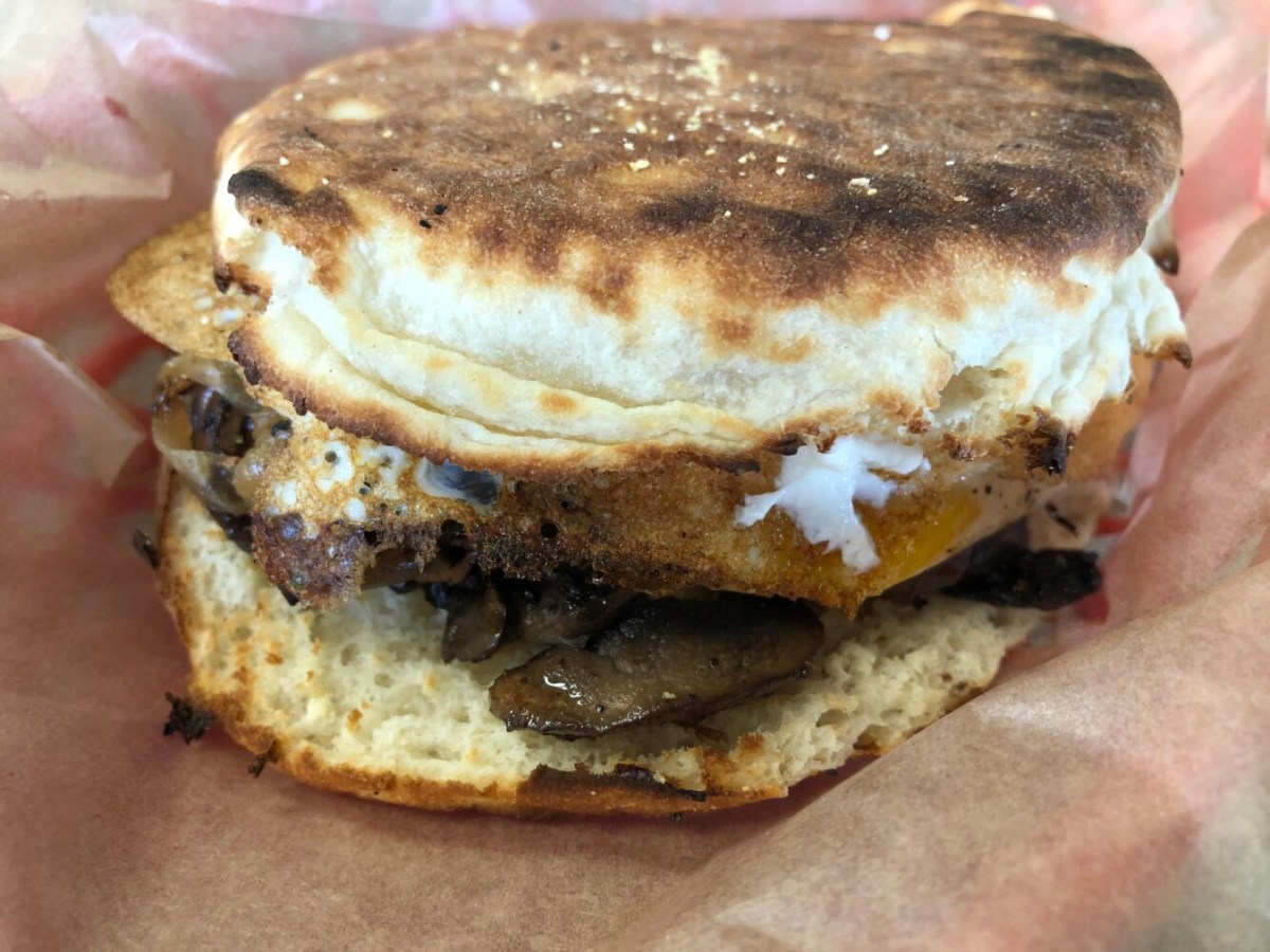 The new Scarborough eatery stuffs an English muffin with grilled mushroom, caramelized onions and goat cheese, and two waffles with sausage, egg and cheddar cheese, served with maple syrup for dipping.