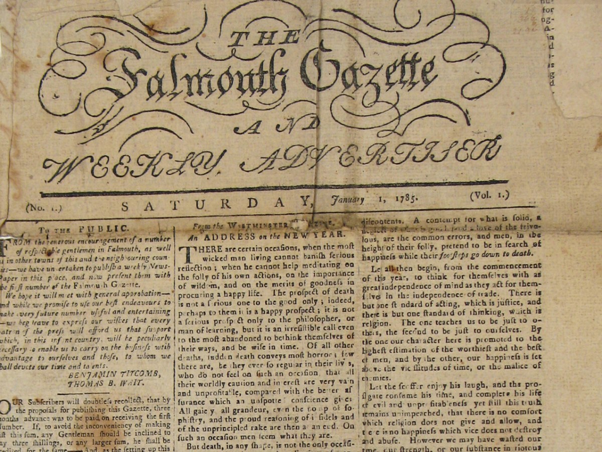 Jan. 1, 1785: Maine’s first newspaper, the Falmouth Gazette, publishes its first issue. The founders, Benjamin Titcomb and Thomas B. Wait, establish the paper for express purpose of advocating for Maine’s separation from Massachusetts, according to historian William D. Williamson (1779-1846). That goal takes another 35 years to achieve. Williamson advocates for Maine’s statehood as […]