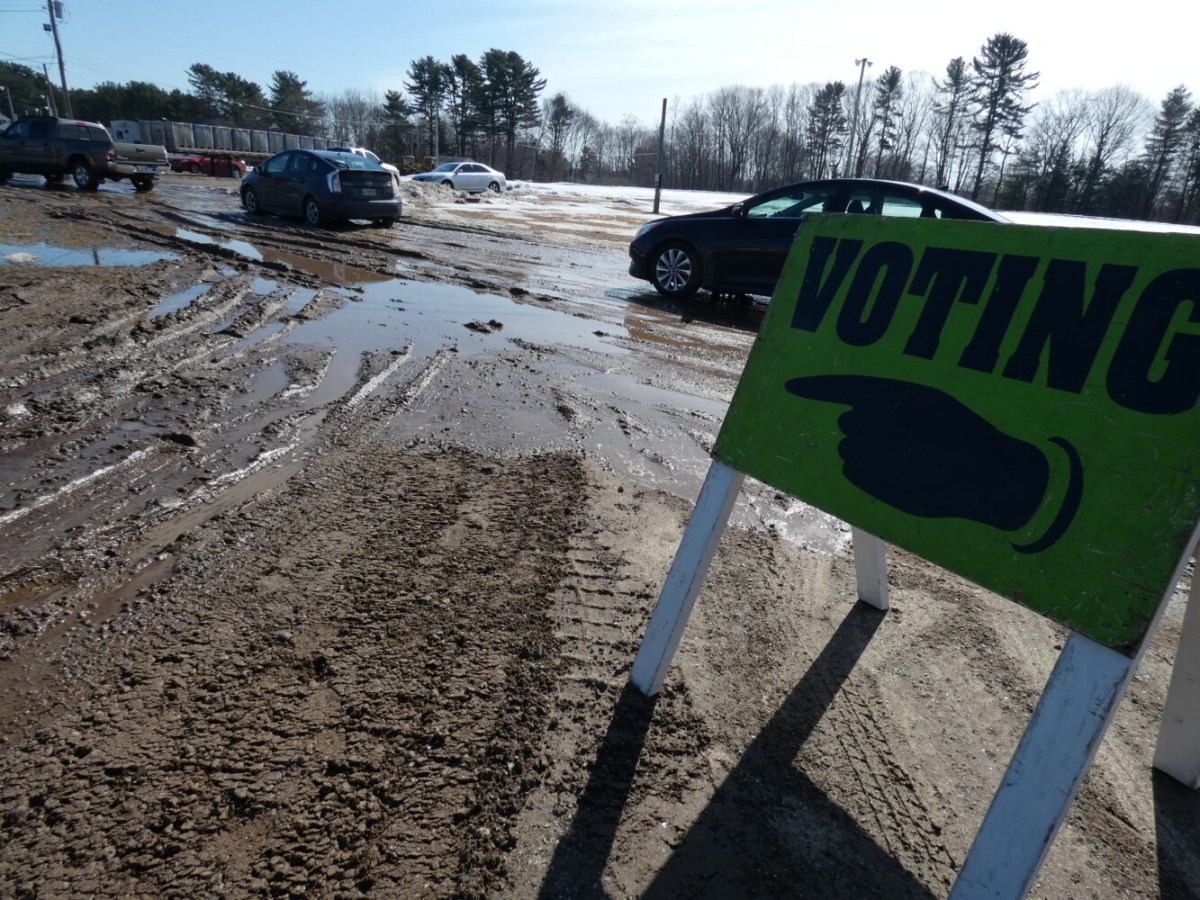One of the entrances to the Topsham Fairgrounds, where voting was held Tuesday, was closed after it turned to mud and officials say they are in search of an alternative polling place.