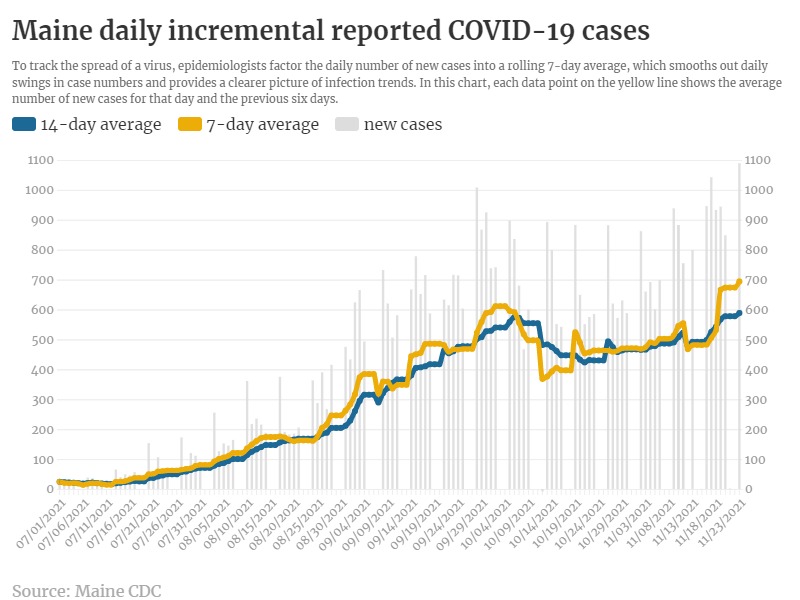 The delta variant continues to drive a surge in infections in Maine as the new omicron variant is being detected elsewhere in the country.