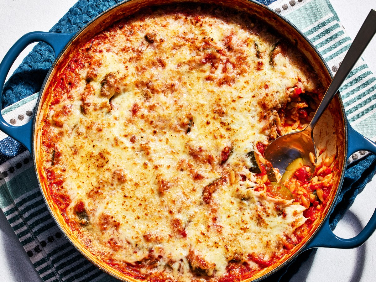 Zucchini gets the spicy Parm treatment in this skillet orzo