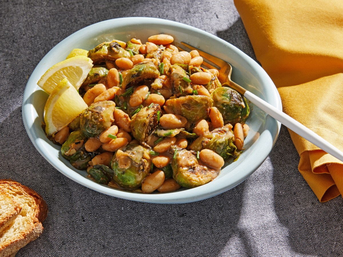 This smoky white beans and Brussels sprouts dish is good with canned beans