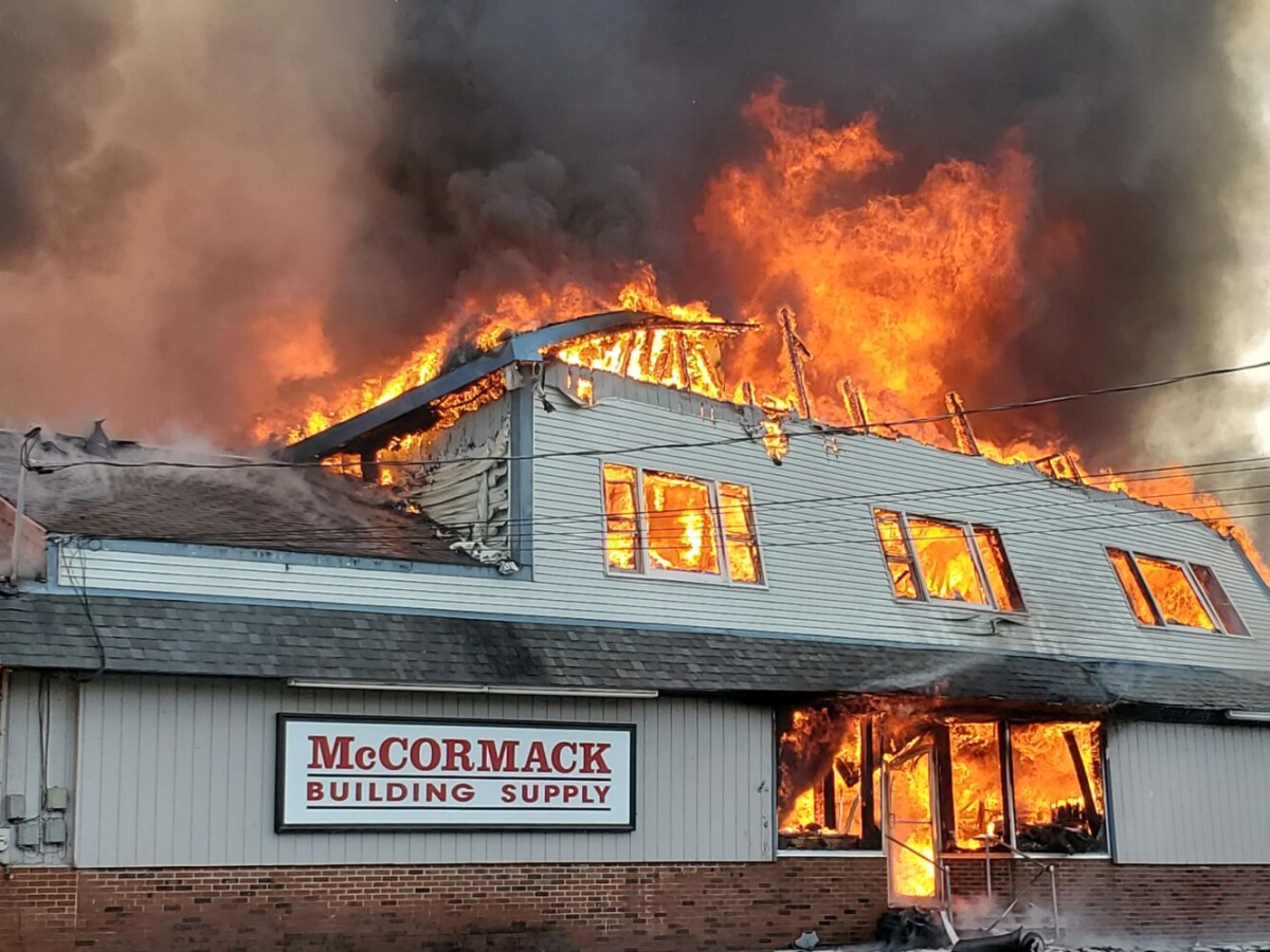 The McCormack Building Supply facility, at 8 Lithgow St., was engulfed in flames Friday afternoon as crews scrambled to contain the blaze.