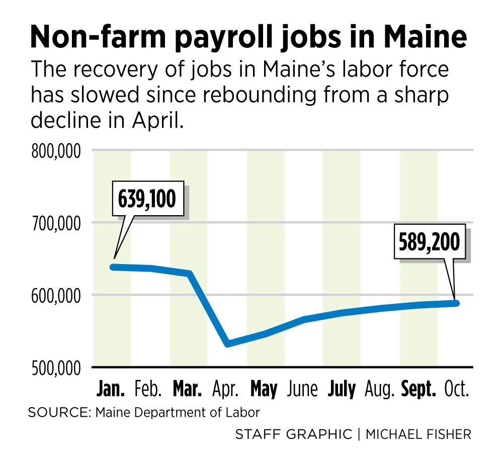 October was the slowest month for job recovery in Maine since businesses reopened this spring.